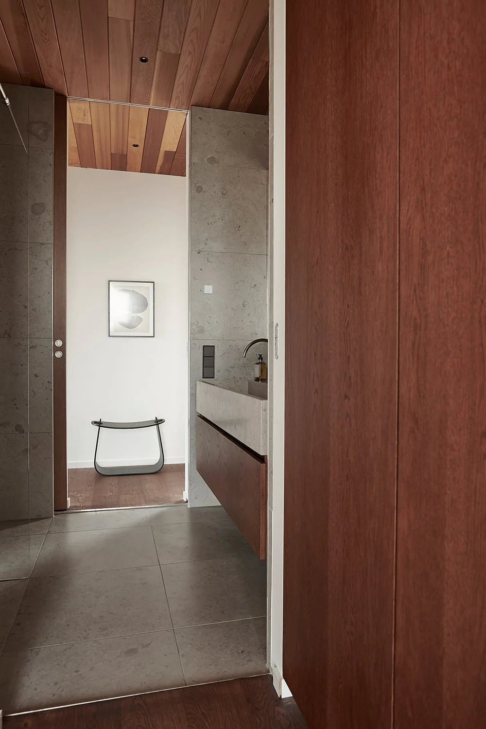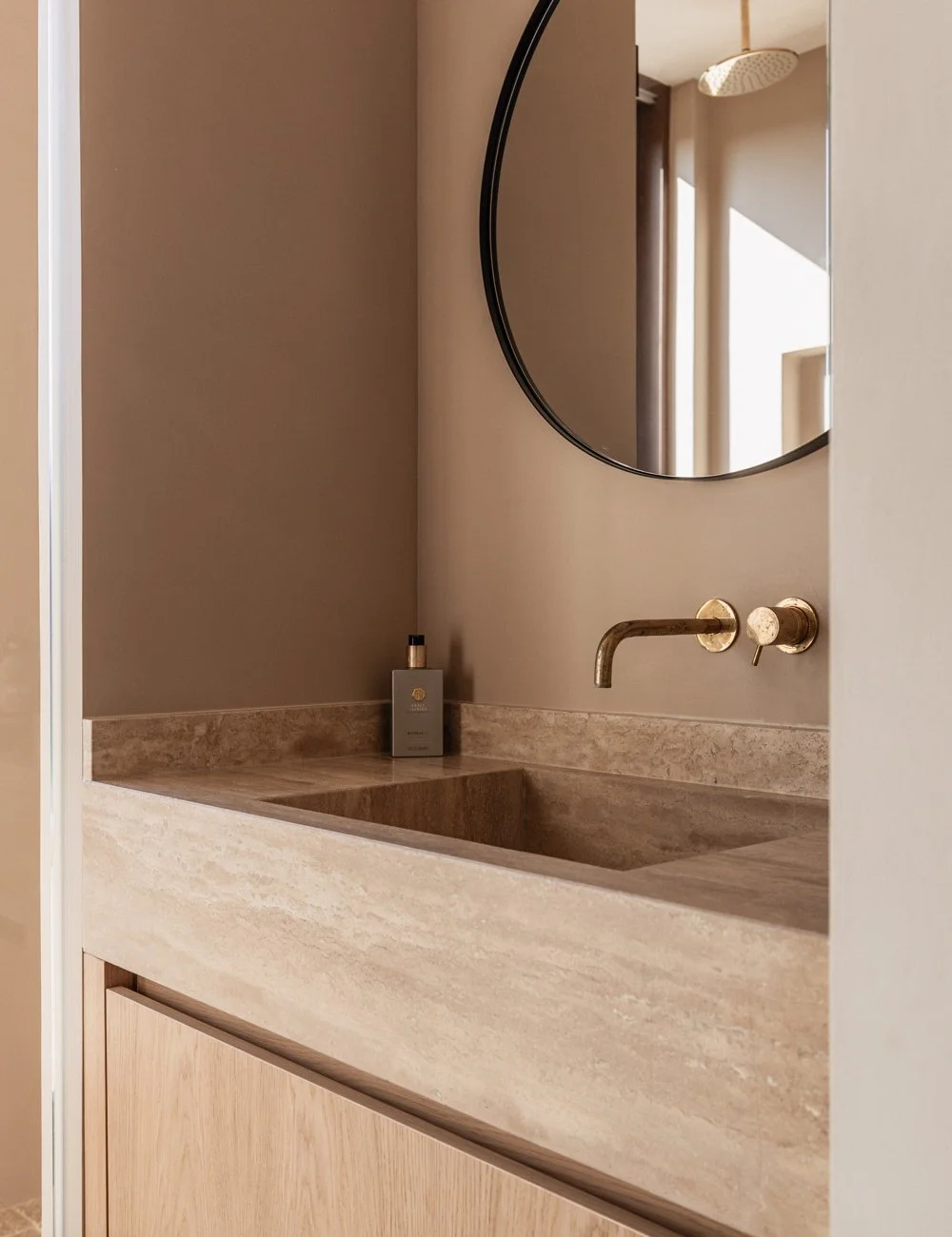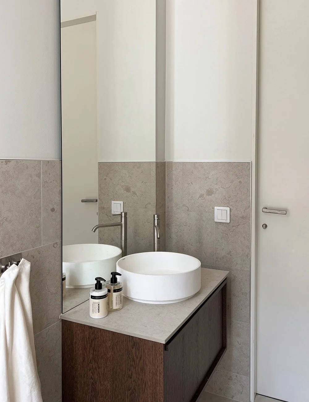 Badeværelseskommode med glatte skuffer og skjult grebsliste. Håndvask i Ölands-kalksten.