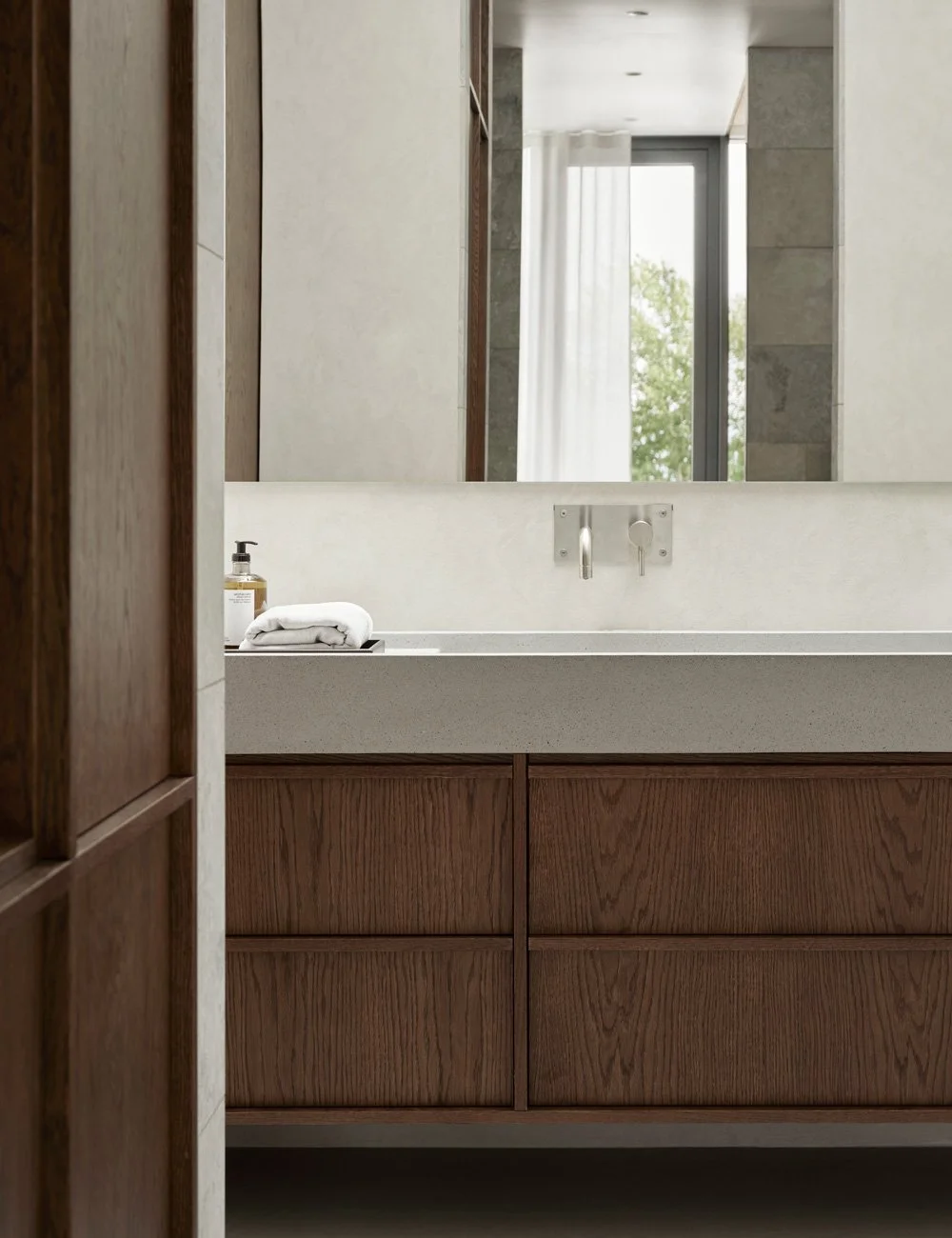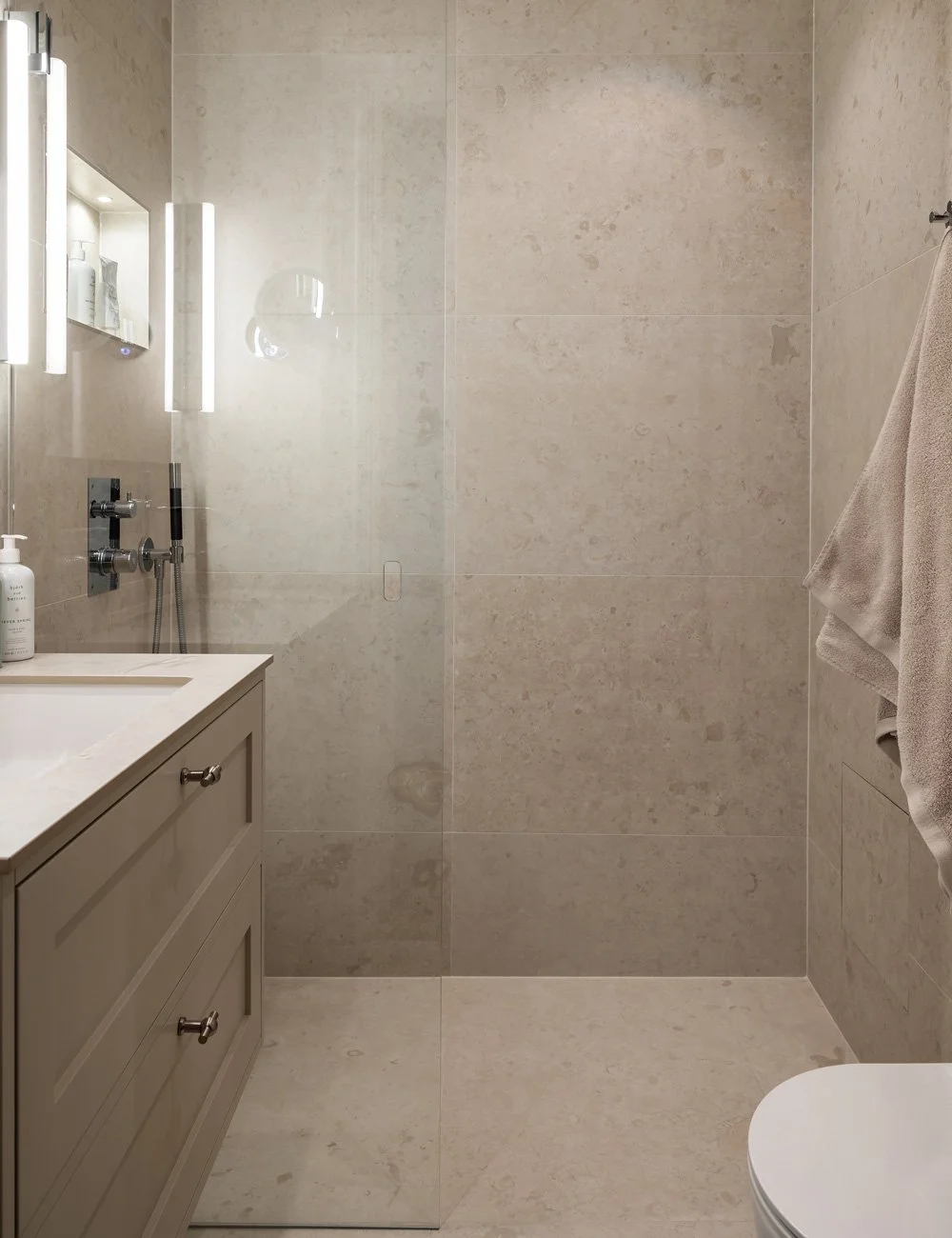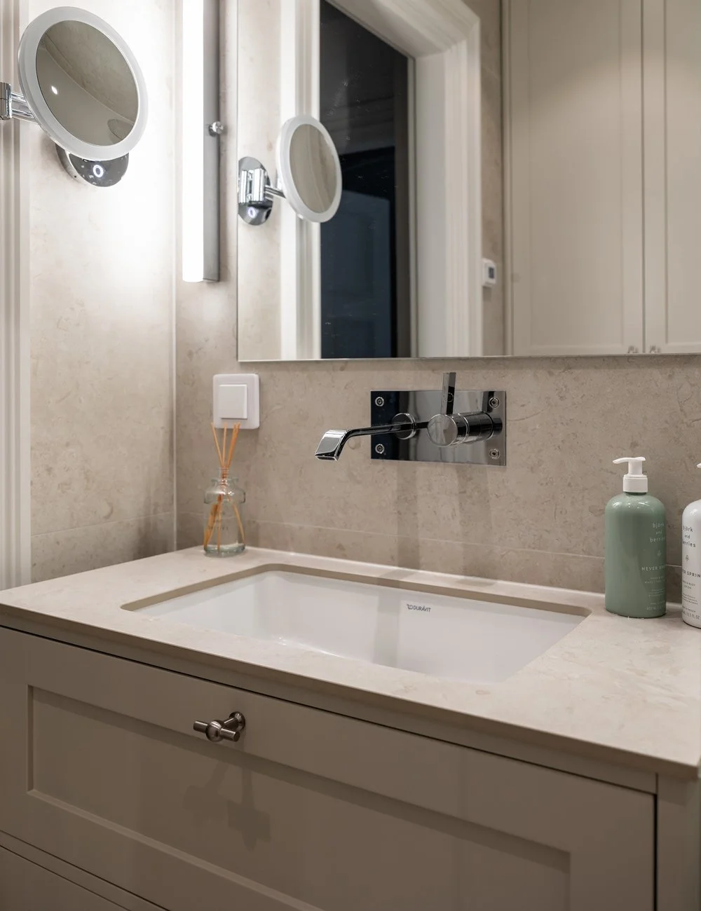 Indbygget skab og hylde, som skaber en smuk, helhedsfølelse på badeværelset.