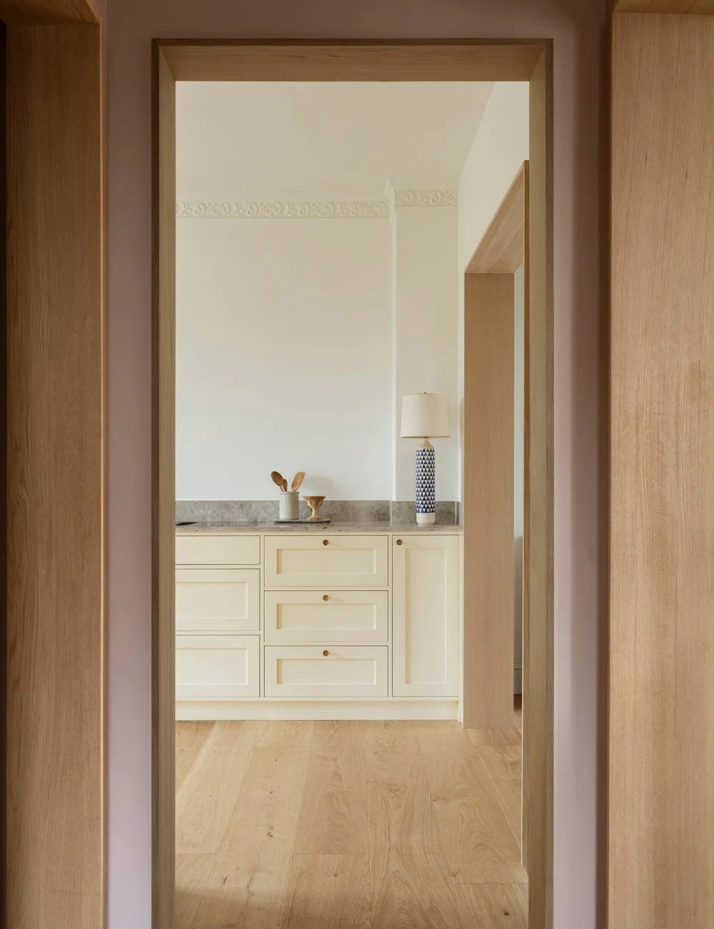 Et køkken i lyse, naturlige toner viser, hvordan lignende farveskalaer skaber sammenhæng og ro i et køkken med åben planløsning.